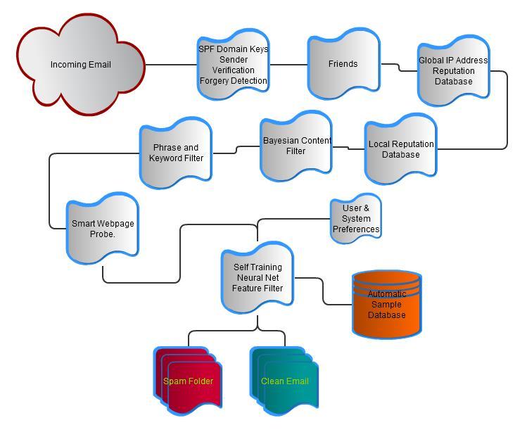 - Bayesian like content filter - Each day the database is used to re-tune the Bayesian like filter which works by statistically anlyzing the words and order of words. This filter does well with text content spam (phishing, scams etc)